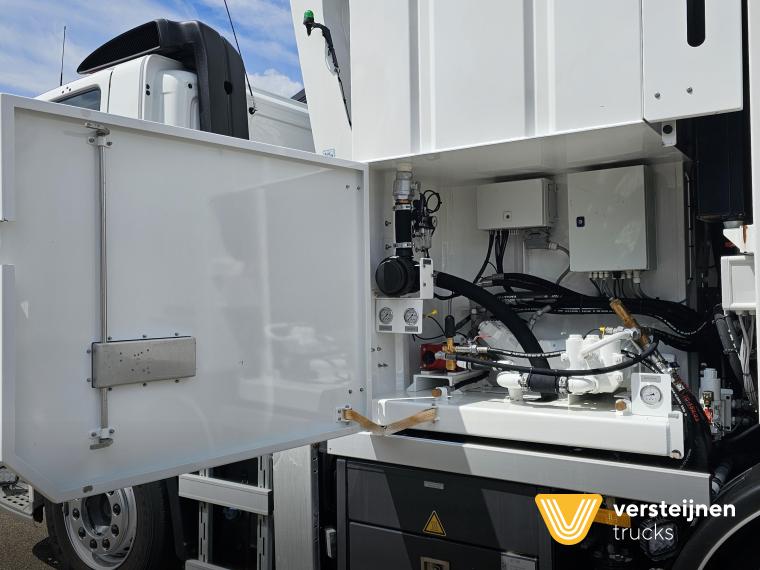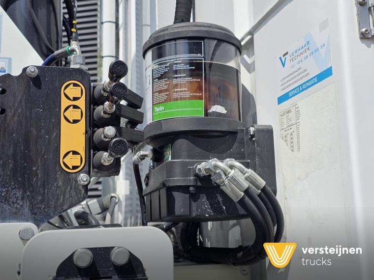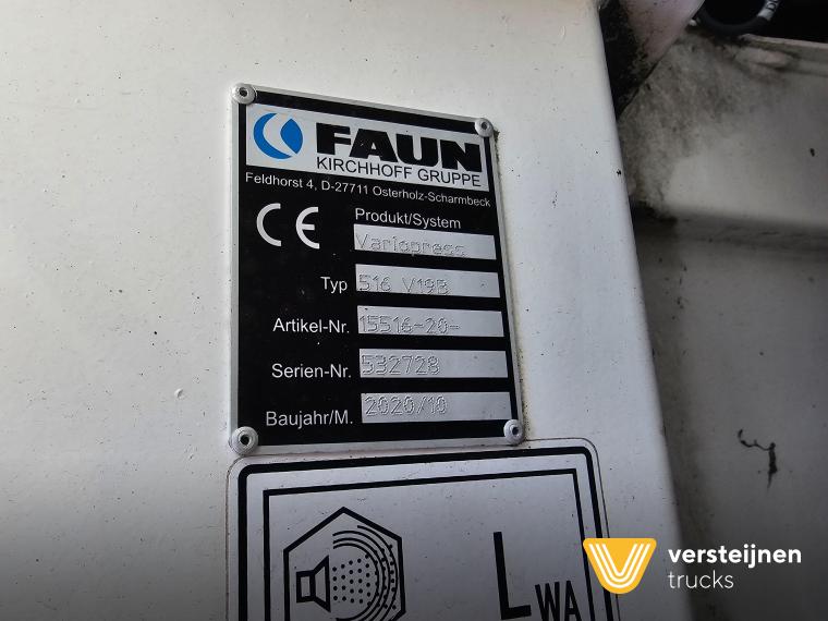 Opbouw: Faun VarioPress V19b 516 /16 m3. Containerwasinstallatie voor ondergrondse containers van 0.8 m3 - 5 m3. Schoonwatertank: 300 ltr met verwarmings unit. Vuilwatertank: 1500 ltr. 2 hogedruk haspels 15 mtr slang. |
