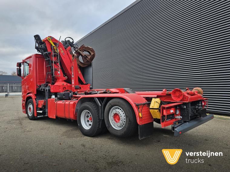 Scania R520 V8 Full air suspension. Retarder. Engine PTO. Crane: Palfinger T.E140Z95 Year 2005 Container system. Hiab Type: XR21S51 21.000 kg. 510 cm. till extended bumper: 600 cm. |