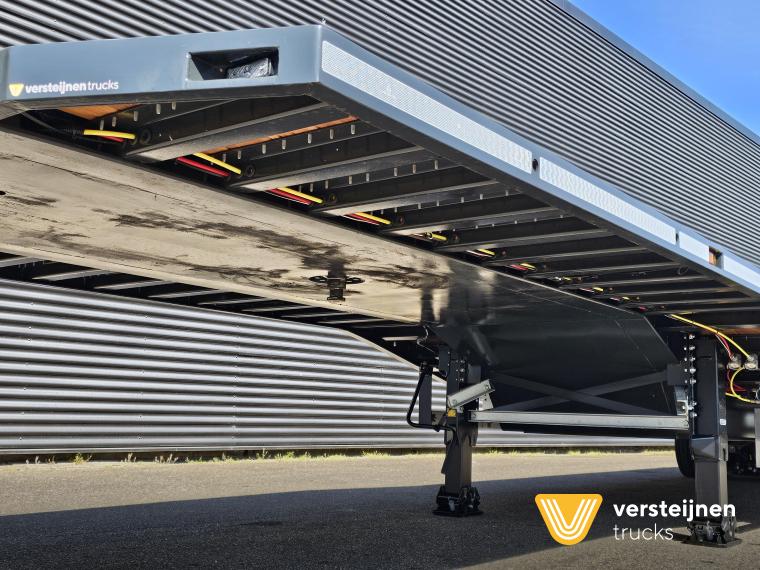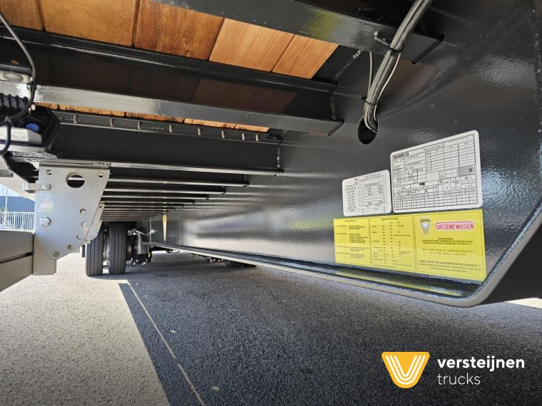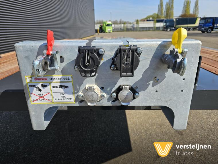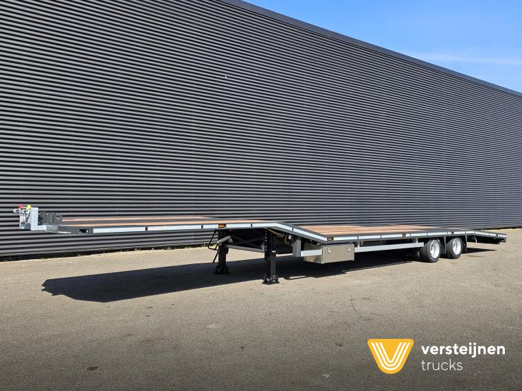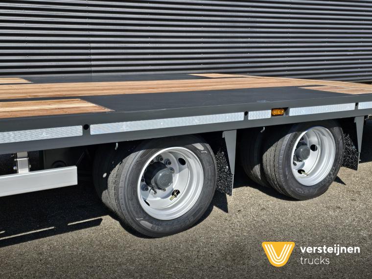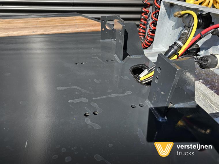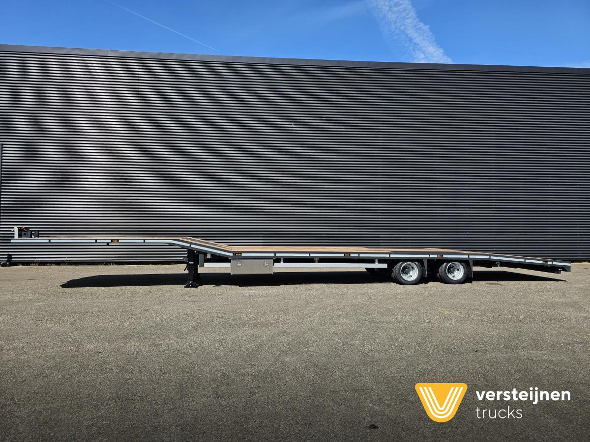 Nieuwe oplegger, direct te leveren. Nog niet geregistreerd. Gescoopeerd ROR assen met trommel remmen. Luchtvering met heffen en dalen ventiel. 4 x Led werklamp. 2 x led flitslamp op achter kader. 4 stuks stopcontact t.b.v. Breedteborden. Randprofiel met gaten rond 30 mm om de 1000 mm. 2 x 10 stuks rongpotten in kantbalk. Bevestigingsconsole t.b.v lier. Achterzijde opbergmogelijkheid voor oprijdbanen, Maximaal maat oprijdbanen: 2400 x 470 x 150 RVS kist 1000 x 350 x 500 mm. Hardhouten vloer. |