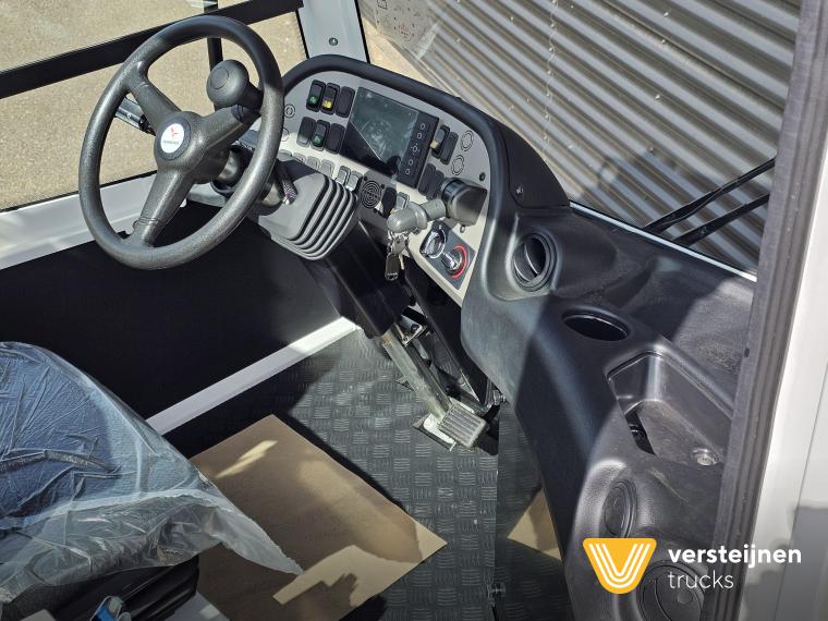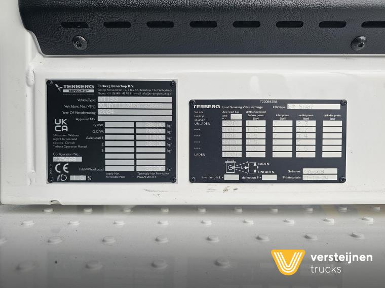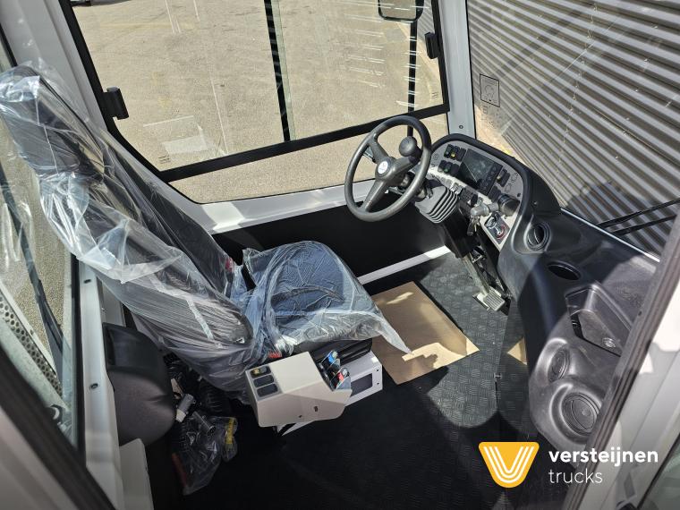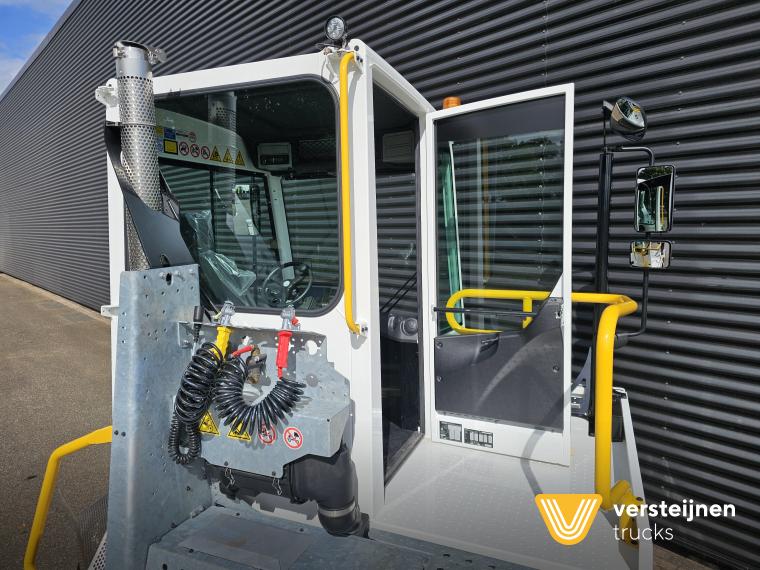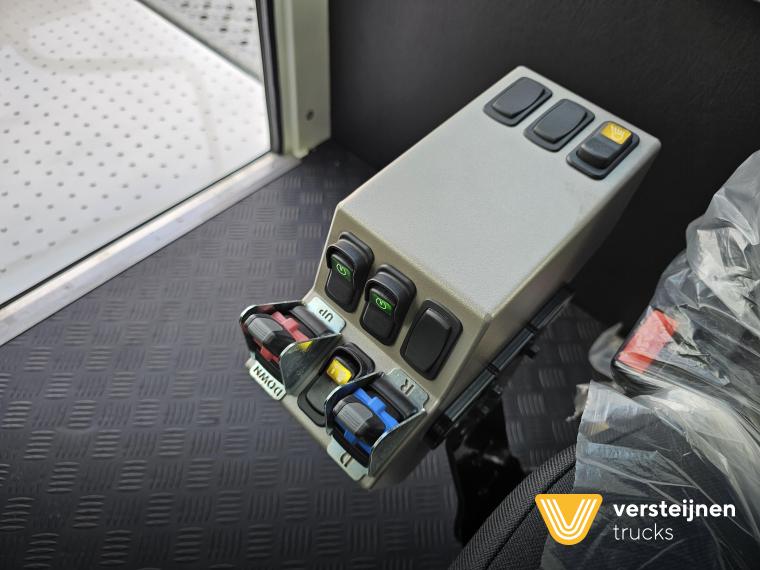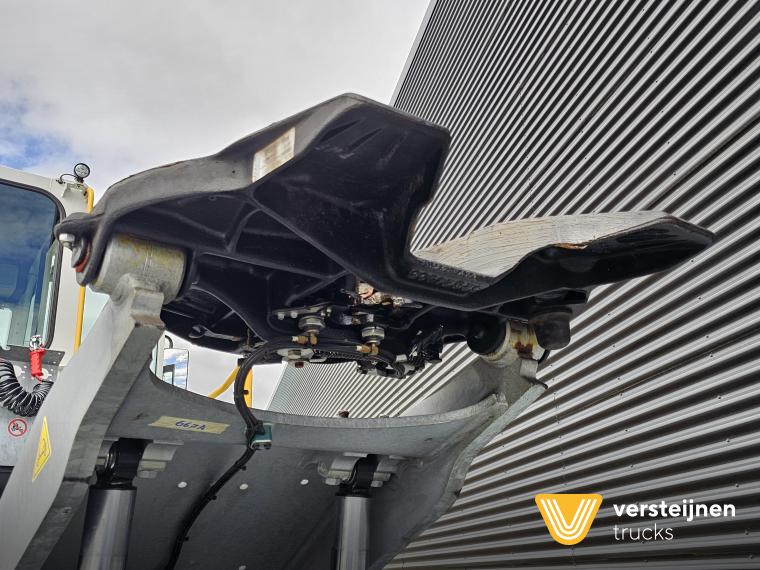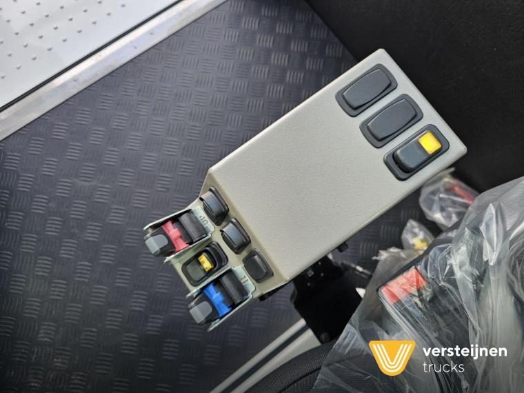 Cabine • Ruitenwisser vóór met ruitensproeier en interval • 2 buitenspiegels • 1 paraboolspiegel • Grote binnenverlichting • Geïntegreerde verwarming • Ruitenwisser voorzijde cabine • Zonneklep voorzijde (horizontaal, volle breedte op voorruit) • Horizontale schuifruit aan bestuurderskant • Alle ramen gehard en getint veiligheidsglas (voorruit gelaagd) • Full color multifunctioneel 5” CAN-bus informatiescherm (DIM) • Opbergruimte voor beker, documenten, helm en accessoires • Geveerde cabine • Kantelbegrenzer • Gele handgrepen (RAL1003) • Spatlappen links + rechts op cabine boven voorwielen Elektra • 7-polige elektrakabel • Achteruitrijdzoemer (90 dB(A)) • LED-zwaailamp • CAN-bus gestuurd systeem • Schakelaars met LED-controlelamp • Claxon • LED-koplampen met knipperlichten en LED-achterlichten (achterzijde cabinedak) • LED-werklamp op achterzijde cabinedak (deurzijde) • 7-polige elektra-aansluiting achter cabine (24V, ISO1185) • 7-polige elektra-aansluiting achter cabine (ABS/EBS, ISO 7638) • Snelheidsmeter (km/uur) • Luchtketels, totale capaciteit 111 liter • 2-leiding AHW-remsysteem achter cabine, met gele en rode spiraalslangen + automatische koppelingen • Remsysteem conform EG 71/320 • Luchtdroger in remsysteem Achteras • Minimale schotelhoogte: ± 1177 mm (andere hoogtes op verzoek) • Maximale hefhoogte: ± 1635 mm (vanaf de grond) • Kunststof spatborden • Oprijdprofielen naar de schotel • Luchtvering Openbare weg pakket Nederland (mobiele machines) • Snelheidsbegrenzing: max. 40 km/h • Achterverlichting verplaatst naar achterplaat • Trottoirspiegel • Achterreflectoren • RDW-keuring en registratie Brandstof/Hydrauliek • Hydrauliektank 60 liter • Dubbelwerkende hydraulische hefcilinders (enkeltraps, slag 425 mm) Chassis • Bumperpenvoorziening voor- en achterzijde • Chassis achterzijde voorbereid voor drawbar-koppeling • Afdekplaten en zijpanelen bij de zijkasten (links + rechts) • Liftframe, zijpanelen, treden en beplating thermisch verzinkt Stuurinrichting & Hydraulisch systeem • Vaste, naar voren gerichte stuurkolom • Hydraulische tank 60 liter • Dubbelwerkende hefcilinders, slag 425 mm • Koppelschotelontgrendeling alleen bij stilstand (< 2 km/h) • Ontgrendelen koppelschotel via twee schakelaars |